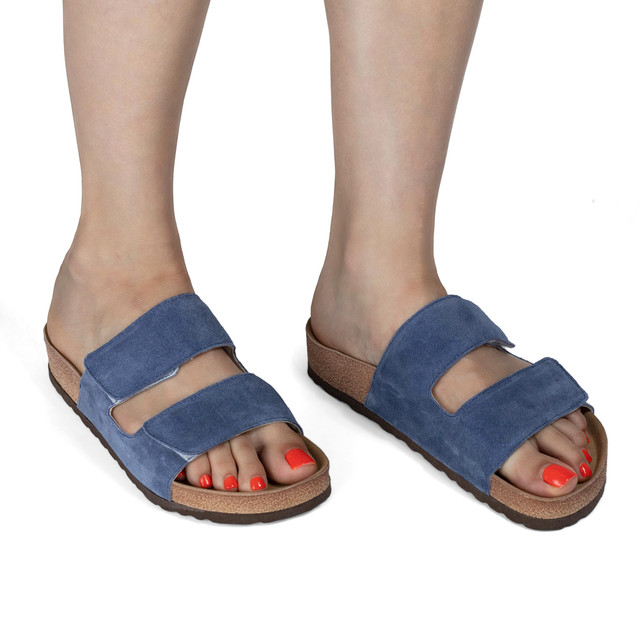 Шльопанці - найактуальніший тренд взуття. Пара дуже зручна та легка. Гарний синій колір підкреслить ваш образ. Верх виконаний із натуральної замші. Устілка в шльопанцях - м'яка і повітряна.